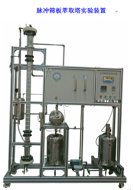 篩板萃取塔,塔兩端直徑較大部分為上澄清段(油水分離)和下澄清段。中間為兩相傳質(zhì)段,在塔的下澄清段裝有脈沖管和輕相分布器;在上澄清段設(shè)有重相分布器、輕相出口以及緩沖器。萃取操作時(shí),由脈沖發(fā)生器提供的脈沖氣流使塔內(nèi)液體作上下往復(fù)運(yùn)動(dòng),迫使液體經(jīng)過(guò)篩板使分散相破碎成較小的液滴分散在連續(xù)相中,并形成強(qiáng)烈的上下湍動(dòng),從而促進(jìn)傳質(zhì)過(guò)程的進(jìn)行。玻璃篩板塔:直徑Ф60mm,有效高 1000mm,板間距50~100mm;上、下擴(kuò)大段直徑Ф100mm,高300~500mm。