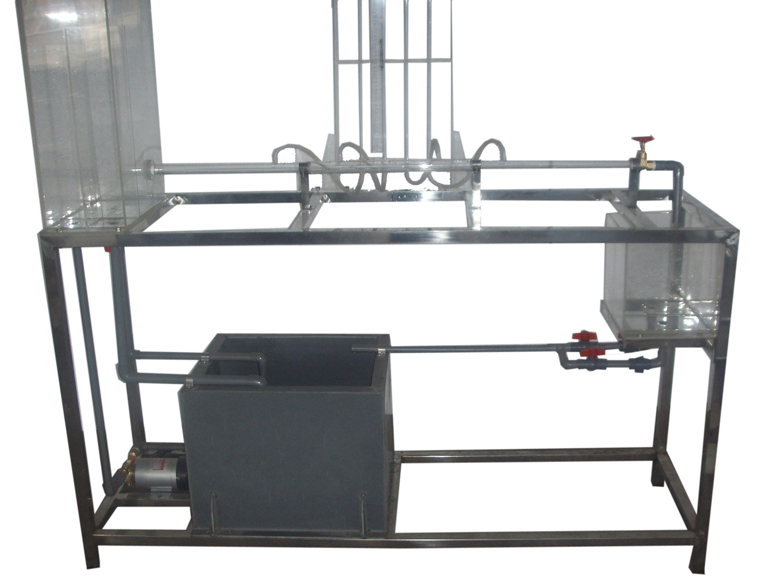有機(jī)玻璃實(shí)驗水箱、局部阻力管、測壓管、水泵、蓄水箱、計量水箱、 刻度標(biāo)尺、 秒表、玻璃溫度計、自循環(huán)裝置、閥門、不銹鋼框架。