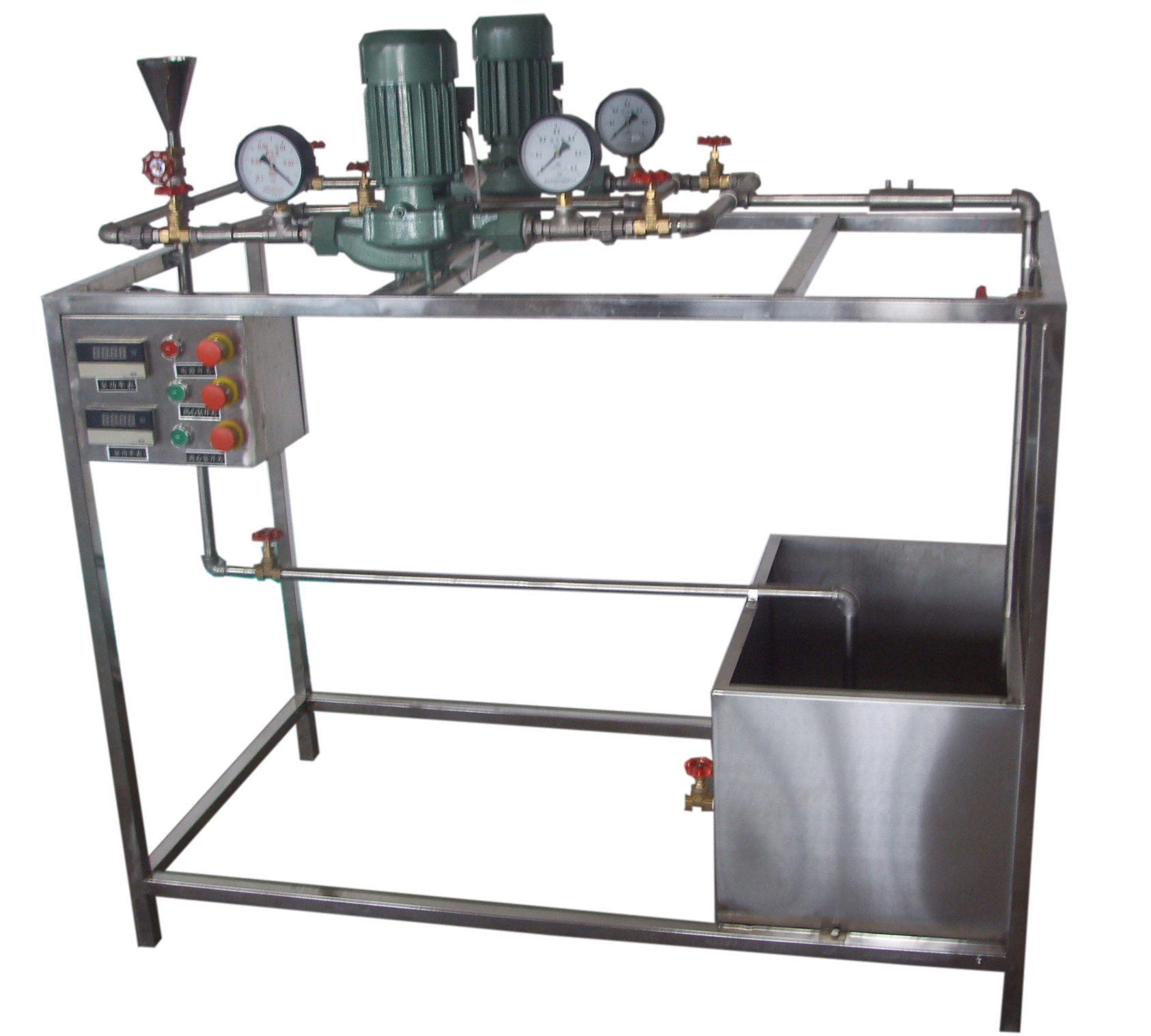 離心泵、蓄水箱、文丘里流量計、壓力表、 U型壓差計、單相功率表、玻璃溫度計、實驗管道、閥門、自循環(huán)裝置、不銹鋼框架。