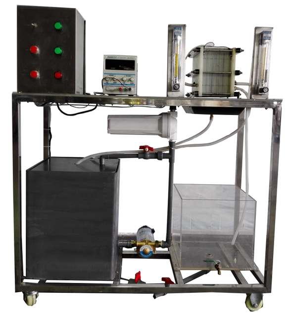 有機玻璃外箱體、電滲析器、直流穩(wěn)壓電源、配水箱、進水泵、流量計、壓力表、不銹鋼框架、控制屏。