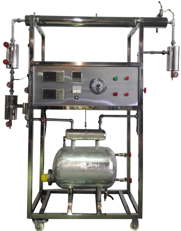 電蒸汽鍋爐、套管換熱器、蒸汽冷凝罐、蒸汽及水流量測試設備、加熱由固體調(diào)壓模塊無級調(diào)節(jié),由多路巡檢儀顯示的溫度測試系統(tǒng) ,不銹鋼臺架及控制屏 等。