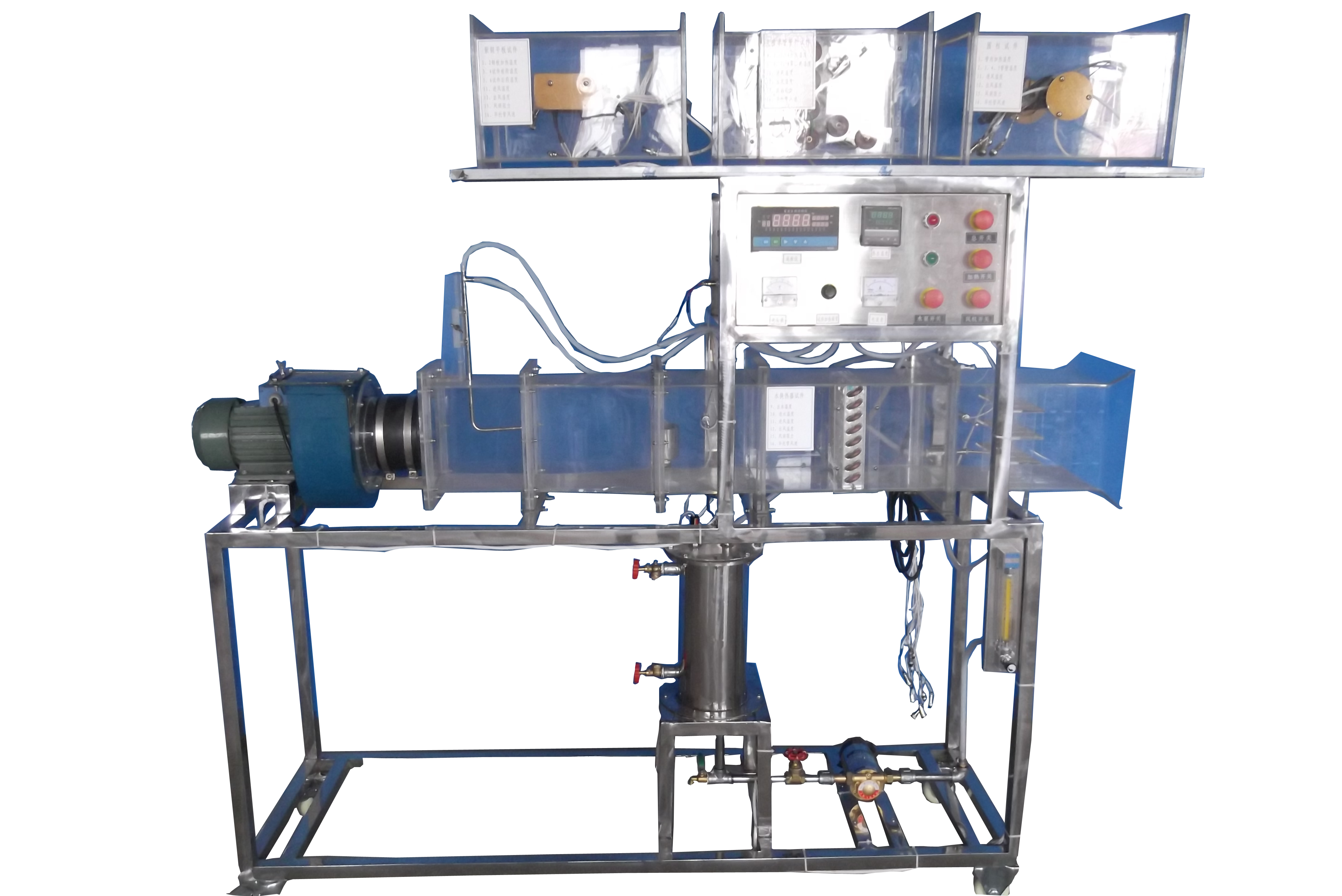 離心 風(fēng)機(jī),自動(dòng)調(diào)節(jié)風(fēng)門,組合式有機(jī)玻璃風(fēng)洞,有機(jī)玻璃實(shí)驗(yàn)管段,有機(jī)玻璃叉排、順排實(shí)驗(yàn)段,旋轉(zhuǎn)圓柱 體 試件,紫銅平板試件 , 穩(wěn)壓電源配電位器調(diào)節(jié)加熱功率,電流表 , 電壓表,畢托管 及 差壓傳感器,熱電阻測(cè)溫,巡檢儀顯示溫度、阻力、流量 ,不銹鋼臺(tái)架等。