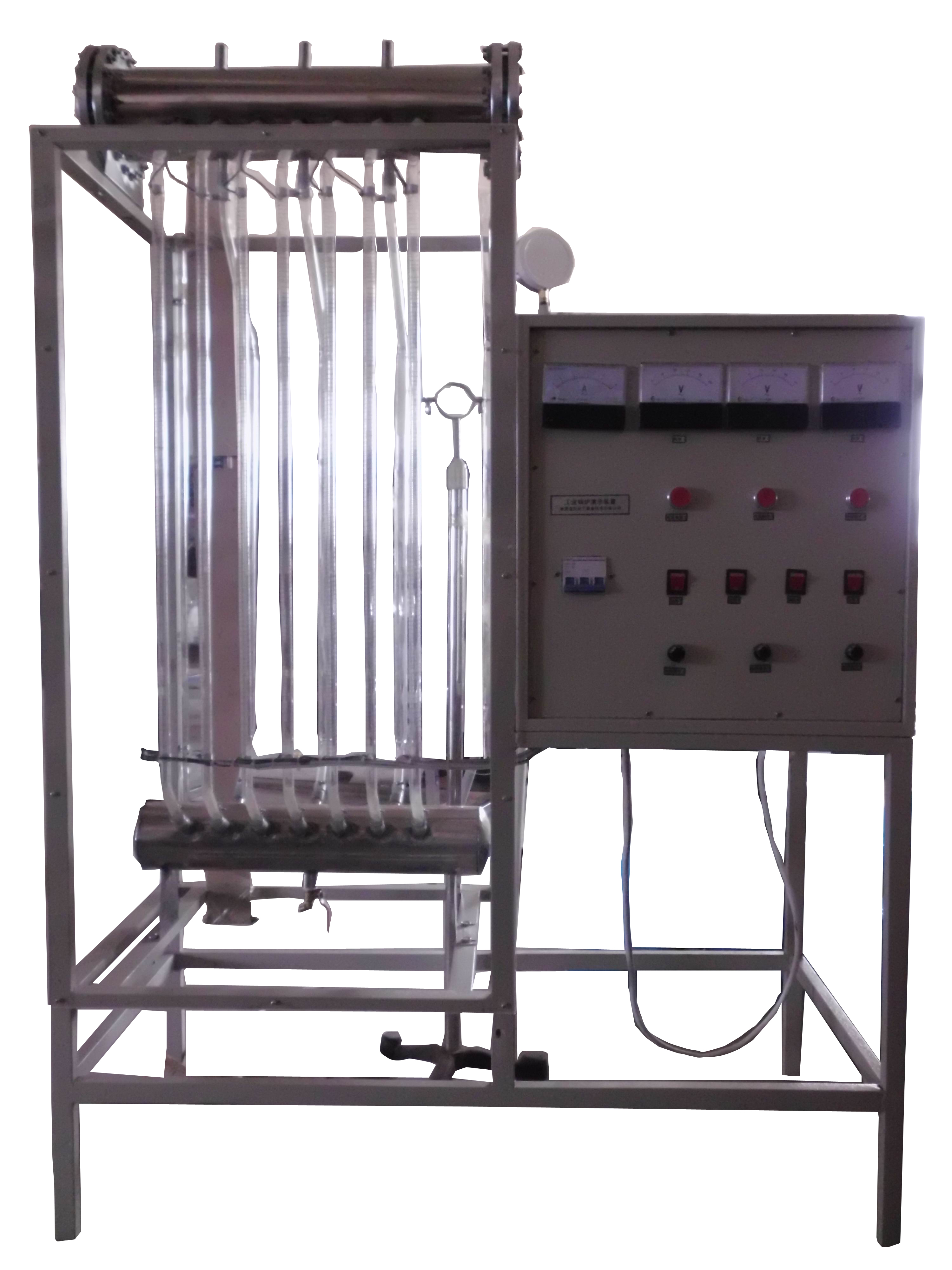 模擬工業(yè)鍋爐上的上鍋筒(可視)、下集箱,玻璃上升管、玻璃下降管,繞在玻璃上升管的電加熱器,加熱控制開關(guān)組,集成調(diào)壓模塊調(diào)節(jié)電流電壓,電流表,電壓表,不銹鋼支架等。