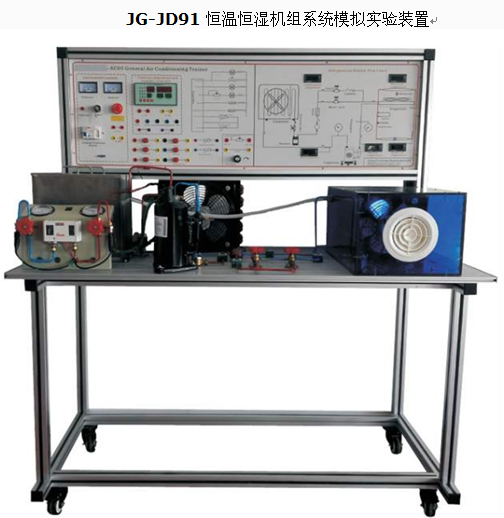 “JG-JD91 恒溫恒濕機(jī)組系統(tǒng)模擬實(shí)驗(yàn)裝置 ” 是采用直流式空氣處理系統(tǒng),并配置壓縮機(jī)、風(fēng)冷冷凝器、蒸發(fā)器、加濕器、電加熱器和風(fēng)管等真實(shí)部件,可測量壓力、溫度、濕度等過程參數(shù)。通過對本裝置的實(shí)驗(yàn),能使學(xué)生熟悉直流式系統(tǒng)的空氣處理過程,并得到熱工測量和計(jì)算的基本訓(xùn)練。本裝置適用于 “ 制冷空調(diào)原理及應(yīng)用 ” 、 “ 制冷空調(diào)技術(shù) ” 、 “ 建筑電氣控制技術(shù) ” 等課程的實(shí)驗(yàn)教學(xué)。
