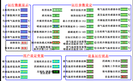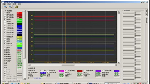 2 )、軟件控制,能在線控制系統(tǒng)的溫度,讀取機組在佳溫度系統(tǒng)制冷冷媒的流量開度數(shù),調(diào)整制冷機組的過熱度,過冷度。該文本顯示界面的左側,以文本的形式實時顯示當前機組的運行數(shù)據(jù)。在界面右側的上半部分,是對通訊信息的顯示,包括通訊角色及通訊端口的設定值以及對當前通訊狀態(tài)的顯示。在界面右側的下半部分 “ 數(shù)據(jù)信息 ” 中,顯示當前接收到哪種數(shù)據(jù)幀、接收到的數(shù)據(jù)幀的地址、等信息。具有上位機調(diào)節(jié)的線上和手動調(diào)節(jié)功能: