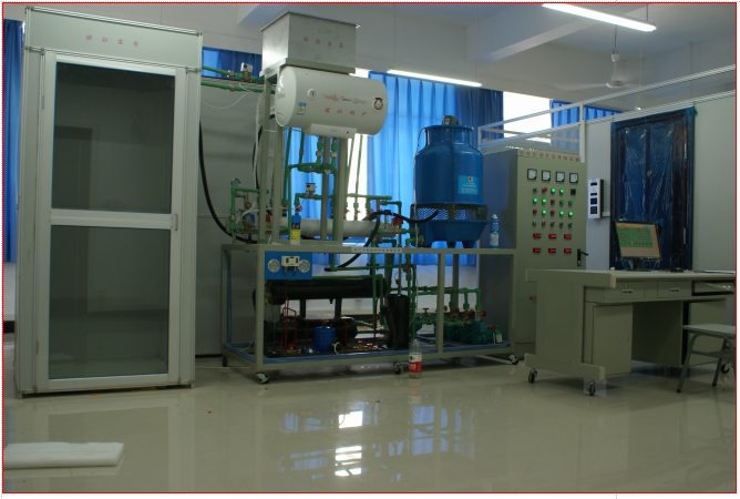 設(shè)備整體與實際中央空調(diào)系統(tǒng)結(jié)構(gòu)相同,采用開放式不銹鋼框架結(jié)構(gòu),各部件布局合理操作方便。系統(tǒng)由制冷機(jī)組、冷卻水系統(tǒng)、冷凍水系統(tǒng)、制熱系統(tǒng)、空氣調(diào)節(jié)系統(tǒng)(風(fēng)管組件)、模擬房間、電控柜、計算機(jī)等部分組成,并配有集水器、分水器、膨脹水箱。