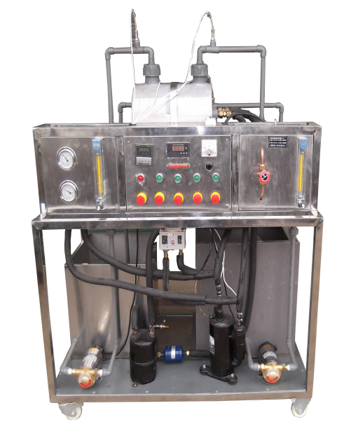 全封閉 制冷壓縮機(jī)、冷凝器、節(jié)流閥、蒸發(fā)器、 冷水泵、熱水泵、玻璃轉(zhuǎn)子流量計(jì) , 水箱、 電加熱裝置、液體轉(zhuǎn)子 流量計(jì)、 8 路萬(wàn)能 巡檢儀、溫度傳感器、高低壓控制器、干燥過(guò)濾器、儲(chǔ)液罐、電流表、電壓表、壓力表 、不銹鋼 移動(dòng)式實(shí)驗(yàn)臺(tái)等組成 。