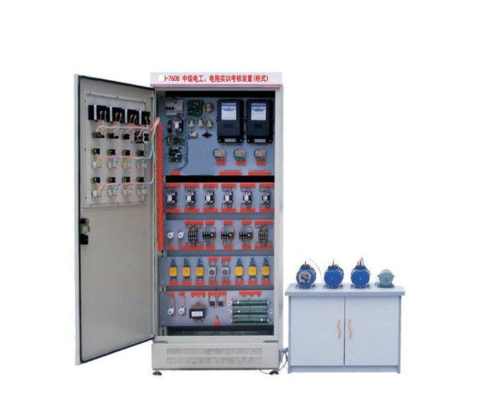 中級電工 . 電拖實訓(xùn)考核裝置按標準電氣控制柜設(shè)計制造規(guī)格,充分利用雙面位置,電工電拖考核柜柜內(nèi)裝有完成各種照明電路所需的單相電度表、日光燈、單聯(lián)開關(guān)、插座、感應(yīng)開關(guān)、漏電開關(guān)等,以及電氣控制所需要的多種低壓電器,如漏電斷路器、熔斷器、電流互感器、交流接觸器、時間繼電器、熱繼電器、中間繼電器、行程開關(guān)、按鈕、信號燈、轉(zhuǎn)換開關(guān)、電壓表、電流表、功率表及電度表等,為了延長電器使用壽命,各電器的接點都與接線端子相連,再由接線端子與被控制電氣連接。