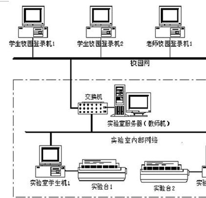 實(shí)驗(yàn)室內(nèi)部網(wǎng)采用星型結(jié)構(gòu),實(shí)驗(yàn)室服務(wù)器由教師端計(jì)算機(jī)擔(dān)任,實(shí)驗(yàn)數(shù)據(jù)采集由學(xué)生端計(jì)算機(jī)執(zhí)行。