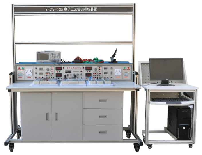 JGZY-135 型電子工藝實訓裝置大體構成上分:鋁合金活動框架、實訓電源臺、實驗元件盒、個人PC(選配)