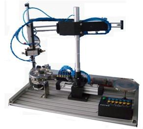 該機械手模型采用臺式結構,由氣動組立機械手、旋轉式供料盤、接料盤、操作面板等組成,并配有控制器(PLC)、傳感器(光電式、電磁式)、步進電機、操作按鈕、電磁閥、減壓閥等,構成典型的機電一體化教學模型。涵蓋了PLC控制、位置控制、氣動控制、檢測等多種技術。本裝置的控制面板采用了按鍵控制。