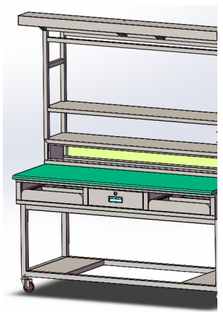 計(jì)算機(jī)組裝與維護(hù)實(shí)訓(xùn)裝置要求采用雙工位結(jié)構(gòu)設(shè)計(jì),共兩層,其中第一層可放置維修工具、套件、儀器儀表;第二層可放顯示器,頂部設(shè)有30W日光燈一盞和風(fēng)扇一臺。實(shí)訓(xùn)臺設(shè)有一個抽屜、兩個鍵盤托架、兩個主機(jī)柜,下方設(shè)有四個剎車的萬向輪。