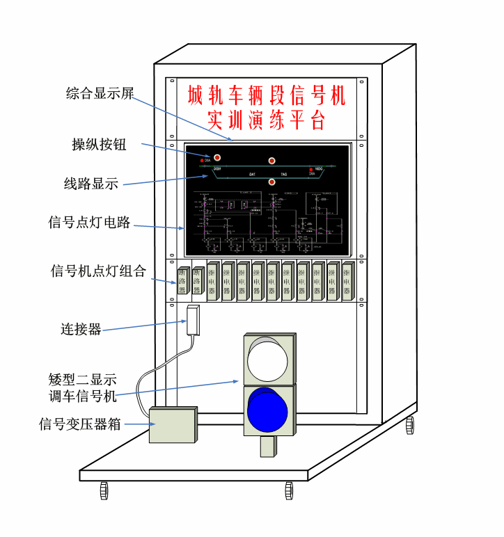 城軌正線信號(hào)機(jī)設(shè)備實(shí)訓(xùn)演練平臺(tái)由信號(hào)組合柜、信號(hào)繼電器、三顯示矮型信號(hào)機(jī)、信號(hào)變壓器、燈絲繼電器、XB箱、信號(hào)機(jī)及控制電路狀態(tài)顯示計(jì)算機(jī)、顯示屏、電源模塊、數(shù)字量驅(qū)動(dòng)采集模塊、斷路器、練功平臺(tái)車(chē)等設(shè)備組成,設(shè)備外觀結(jié)構(gòu)如下圖所示。