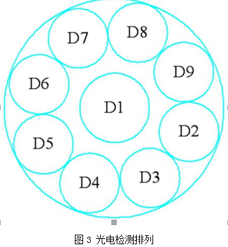圖3所示是太陽光電定位裝置中光電檢測電路的俯視圖,共由9個光電三極管組成。正中央1個,旁邊8個圍成一圈。將此檢測板用一不透光的下方開口的圓柱體蓋住,圓柱體的直徑略大于檢測板的外圓。圓柱體的上方中央開一個與檢測用的光電二極管直徑相同的洞,以便光線通過。將整個光電檢測裝置安裝在太陽能光電池板上,光電二極管的檢測面與電池板平行。在圓柱體的外面不受圓柱體遮擋的地方(確保會受到光線的照射)也安裝一個光電二極管,其朝向與圓柱體內(nèi)的光電二極管朝向相同,用于檢測環(huán)境亮度,并與圓柱體內(nèi)的每個光電二級管及運放(可用lm324集成電路中的一個)構(gòu)成一個比較電路。這樣當圓柱體內(nèi)的光電二極管沒有受光線照射時,運放將輸出低電平,此電平可接到的輸人端進行檢測,圓柱體內(nèi)的每個光電二級管各用一個plc的輸入端,共9個。這樣就可以檢測太陽光線的朝向,來決定哪個電機轉(zhuǎn)動,向哪個方向轉(zhuǎn)動。另外,為了增大光電二極管的檢測范圍,視實際情況需要,也可再增加一圈緊密排列的光電二極管,外圈的光電二極管與內(nèi)圈的相應(yīng)位置的光電二極管并聯(lián)。