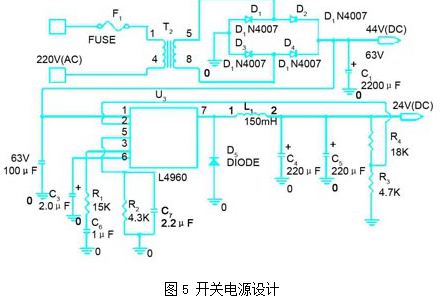 電源電路采用開關(guān)電源設(shè)計,具有高效率、低損耗的特點。采用開關(guān)控制芯片l4960,能提供5.1~40v的輸出電壓和2.5A的輸出電流。電源電路如圖5所示,通過調(diào)整兩個電阻r3和r4,以產(chǎn)生12-24v直流電壓,24v(dc)用于plc電源,44v(dc)直接取自整流橋側(cè)供給直流電機。如果用于光伏逆變系統(tǒng)的跟蹤系統(tǒng),220v(ac)可以直接取自光伏逆變電源。