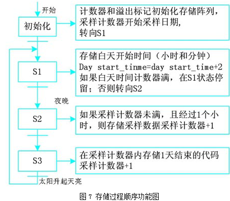 (3) 采樣數(shù)據(jù)存儲。這是一個在線采集存儲過程,通過ram數(shù)據(jù)存儲內(nèi)部的特殊矩陣,每一小時讀取光敏電阻的值。數(shù)據(jù)采集白天進行,晚上停止,直到第二天日出。采集的時間(小時和分鐘)存儲在不同的矩陣,然后在pc機的屏幕上顯示出來。當ram內(nèi)存滿時,將不再存儲數(shù)據(jù),直到復位操作將存儲數(shù)據(jù)清除。這部分程序采用順序功能圖表(sequential functioning chart,sfc)進行編程,算法如圖7所示。
