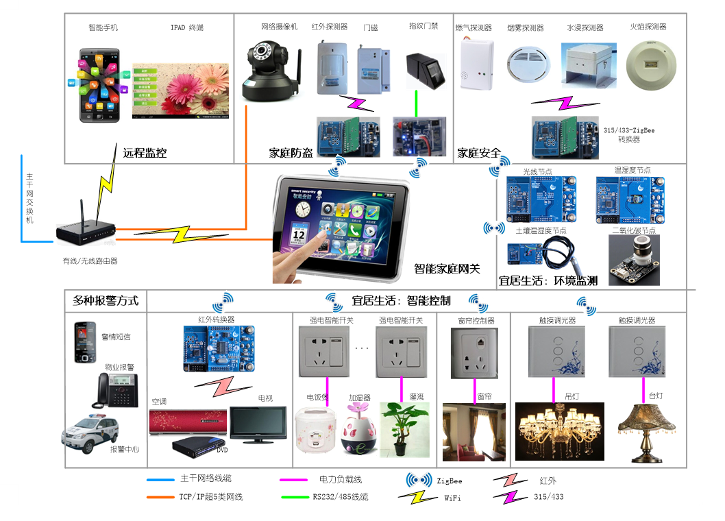 智能家居體驗廳(SeaIOT-SmartHome)是針對高等院校物聯(lián)網(wǎng)工程應(yīng)用的需求,綜合運用智能傳感器、智能控制器、無線傳感器網(wǎng)絡(luò)、嵌入式中間件、移動通信、軟件工程等物聯(lián)網(wǎng)技術(shù)以及多學(xué)科技術(shù)的交叉融合,提出的面向?qū)嶋H生活的智能家居整體解決方案。