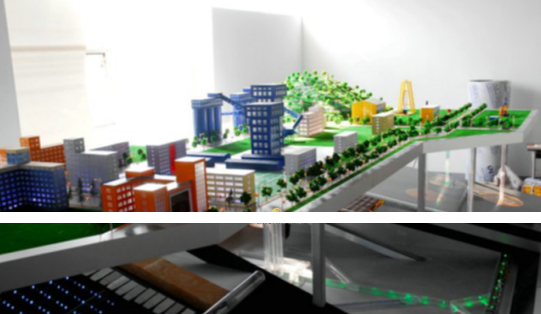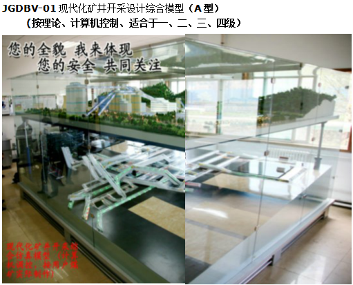 礦井開采設(shè)計(jì)綜合模型使用井上、下對(duì)照方式,能夠全面、系統(tǒng)模擬我國(guó)典型現(xiàn)代化煤礦的井上地面生產(chǎn)建筑布局和通風(fēng)、壓氣、排水、提升、運(yùn)輸、轉(zhuǎn)載、供電、調(diào)度等機(jī)電設(shè)備的生產(chǎn)運(yùn)行系統(tǒng)。具有完整的地面工業(yè)廣場(chǎng)和井下生產(chǎn)系統(tǒng)的開拓系統(tǒng)及齊全的采煤法(走向長(zhǎng)壁和傾斜采煤法),左翼布置綜采采區(qū),右翼布置高檔普采工作面,多種通風(fēng)形式。電動(dòng)燈光演示其生產(chǎn)工藝過程,能反映全礦通風(fēng)系統(tǒng),體現(xiàn)掘進(jìn)通風(fēng)與安全設(shè)施(三專兩閉鎖),顯示瓦斯監(jiān)測(cè)系統(tǒng)、CH4濃度超過1.0時(shí)開始報(bào)警,超過1.5時(shí)開始斷電,并模擬演示礦井災(zāi)變(如火災(zāi)或瓦斯爆炸)發(fā)生時(shí),整個(gè)通風(fēng)系統(tǒng)發(fā)生連鎖反應(yīng)。多媒體可視化系統(tǒng)?娠@示主要工作點(diǎn)、轉(zhuǎn)載點(diǎn)的工作狀況,模擬生產(chǎn)指揮中心監(jiān)測(cè)監(jiān)控。展現(xiàn)了我國(guó)常用的各種采煤方法。并采用多種剖切手法,展現(xiàn)出各巷道之間的空間立體關(guān)系。在計(jì)算機(jī)與PLC相結(jié)合的控制手段下,能夠適應(yīng)不同專業(yè)的講課需要。為了滿足視覺效果更方便于教學(xué)同,地面工業(yè)廣場(chǎng)采用可升降系統(tǒng)。