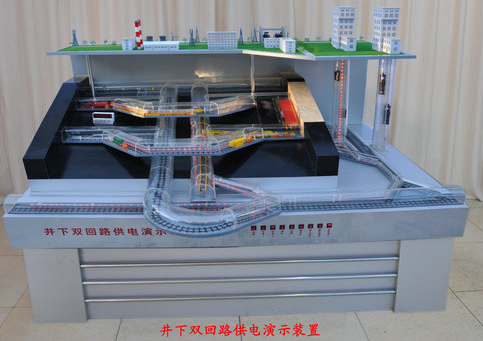 該現(xiàn)代化礦井雙回路供電系統(tǒng)演示裝置通過(guò)模擬線路演示:區(qū)域網(wǎng)到地面變電所,礦發(fā)電廠到地面變電所的供電線路。再通過(guò)光電系統(tǒng)演示:地面變電所向井下中央變電所實(shí)行雙回路供電,中央變電所向水泵房直接供電,采區(qū)變電所由中央變電所實(shí)行雙回路供電。回采工作面和掘進(jìn)工作面的電氣設(shè)備分別由采區(qū)變電所供電。