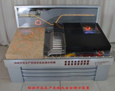 綜采開采生產(chǎn)系統(tǒng)及安全演示裝置直觀反映出綜采工作面生產(chǎn)工藝、巷道布置、通風(fēng)系統(tǒng)、綜合防塵、隔爆設(shè)施、瓦斯抽放、瓦斯監(jiān)測(cè)、運(yùn)輸系統(tǒng),利用聲、光、機(jī)械傳動(dòng)技術(shù)顯示工藝流程等。