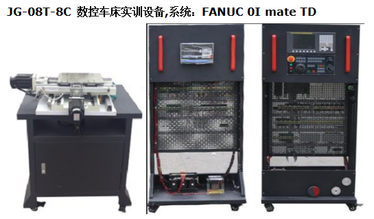 JG-08T-8C型數(shù)控實訓(xùn)設(shè)備是由FANUC 0I MATE-TD數(shù)控系統(tǒng),機床電氣控制接口板、主軸變頻調(diào)速實驗板、交流伺服驅(qū)動器及伺服電機、輸入輸出模塊、四工位刀架、低壓電氣元件的原理和接線、編程及機械等組成。