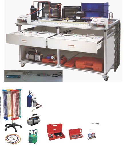 1、實訓臺采用鋁型材臺架加實訓模塊結構,裝置采用一體化設計,由導軌式鋁合金安裝平臺、空調系統(tǒng)、電冰箱系統(tǒng)、電氣控制系統(tǒng)等組成。底部安裝有四個帶剎車的腳輪,可以方便的移動和固定。設備配置空調制冷系統(tǒng)管路1套、直冷電冰箱制冷系統(tǒng)管路1套、安全插端子排,壓力表(1.5MPa)2只(3.5 MPa)2只等。