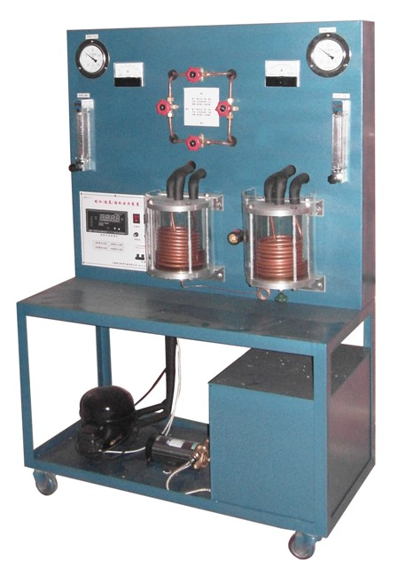 主要配置:由壓縮機(jī)、冷凝器、壓力真空表、蒸發(fā)器、流量計(jì)、水泵、電壓表、測(cè)溫系統(tǒng)、電流表、水箱、配電控制箱、有機(jī)玻璃防護(hù)罩、控制閥門、8路溫度巡檢儀。