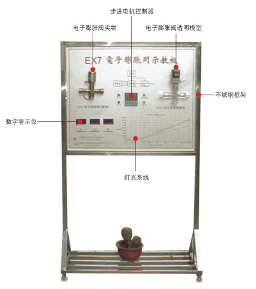 主要配置:不銹鋼可移式支架、EX7電子膨脹閥實物、膨脹閥透明模型、步進電機控制器、數(shù)字顯示儀表、燈光系統(tǒng)等組成。