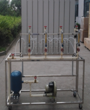 不銹鋼實驗臺、旋渦氣泵、穩(wěn)壓罐、供氣干管、用戶支管、用戶流量計、壓差板、單管壓力計等組成。氣泵工作產(chǎn)生的氣流進(jìn)入穩(wěn)壓罐,經(jīng)瀉流穩(wěn)壓后,供給模擬的燃?xì)庥脩,每個用戶由支管、流量計和尾閥組成,在壓差板上設(shè)有9只單管壓力計,可分別測量干管起點的壓力、用戶支管及包含燃具的阻抗在內(nèi)的壓差,而第9只壓力計則既測量最終用戶的阻抗,又是干管的終點壓力。通過調(diào)整瀉流閥、用戶流量及尾閥進(jìn)行實驗。