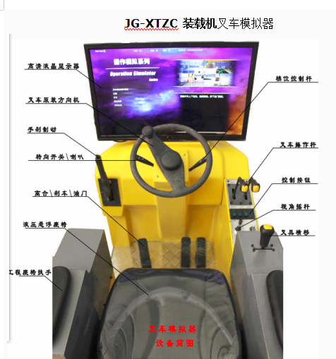 該設備硬件由駕駛座椅、駕駛座艙、底座平臺、PC系統,視景顯示器,方向機,檔位桿,操作桿, 360視角調整搖桿、油門制動離合踏板,手剎制動桿,數據采集卡、中樞控制臺及各種功能控制按鈕組件等組成。設備采用與真機相同的操作部件,逼真的操作手感,使得其操作功能、操作感覺與真機完全吻合;