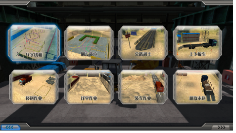 00001. 訓練課題按照三個模式分別進行操作訓練:基礎訓練,考核操作和理論學習。1)基礎訓練模式:8字繞樁、側方移位、移料作業(yè)、裝車作業(yè)、公路剝土、木料抓取、找平作業(yè)、空動作、自由作業(yè)操作等功能模塊。