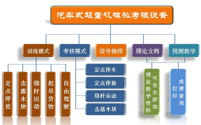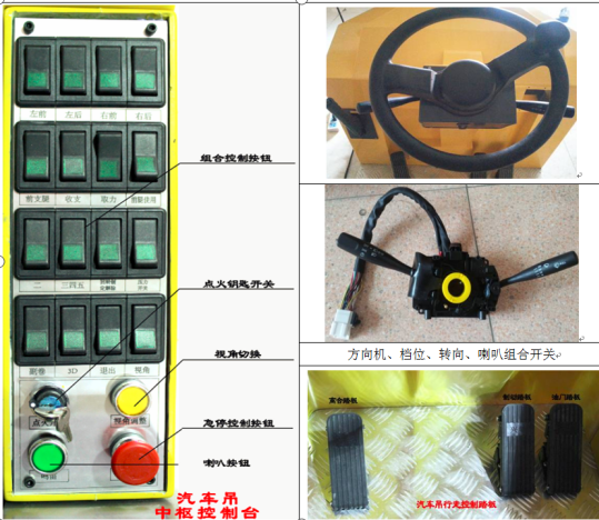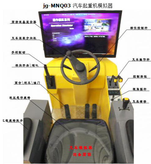 該設(shè)備硬件由懸浮式座椅、駕駛座艙、底座平臺、PC系統(tǒng),視景顯示器,方向機(jī),檔位桿,操作手柄,IC卡讀寫裝置、360視角調(diào)整搖桿、油門、離合、剎車踏板,轉(zhuǎn)向開關(guān),數(shù)據(jù)采集卡、中樞控制臺及各種功能控制按鈕組件等組成。設(shè)備采用與真實汽車起重機(jī)相同的操作部件,逼真的操作手感,使得其操作功能、操作感覺與真機(jī)完全吻合;