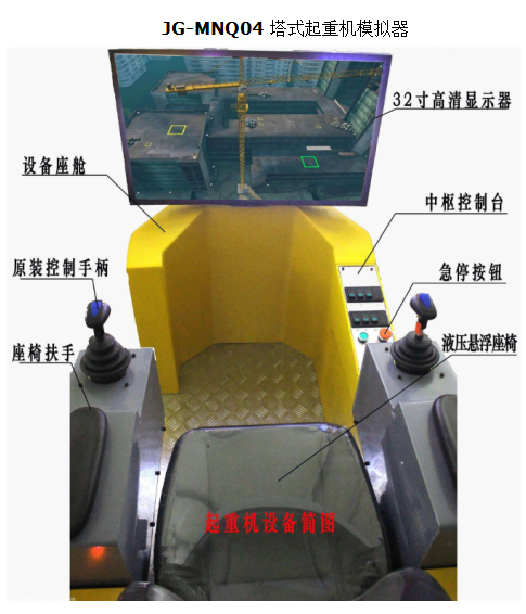該設備硬件由懸浮式座椅、駕駛座艙、底座平臺、PC系統(tǒng),視景顯示器,五級變速原裝塔吊控制主令,急停按鈕,IC卡讀寫裝置、360視角調(diào)整搖桿、數(shù)據(jù)采集卡、中樞控制臺及各種功能控制按鈕組件等組成。設備采用與真實塔吊相同的操作部件,逼真的操作手感,使得其操作功能、操作感覺與真機完全吻合;