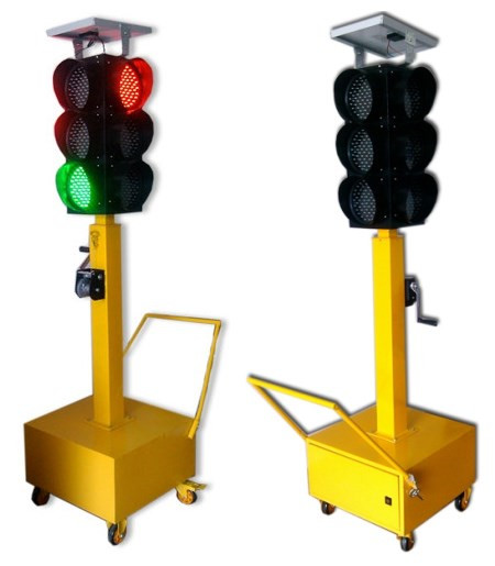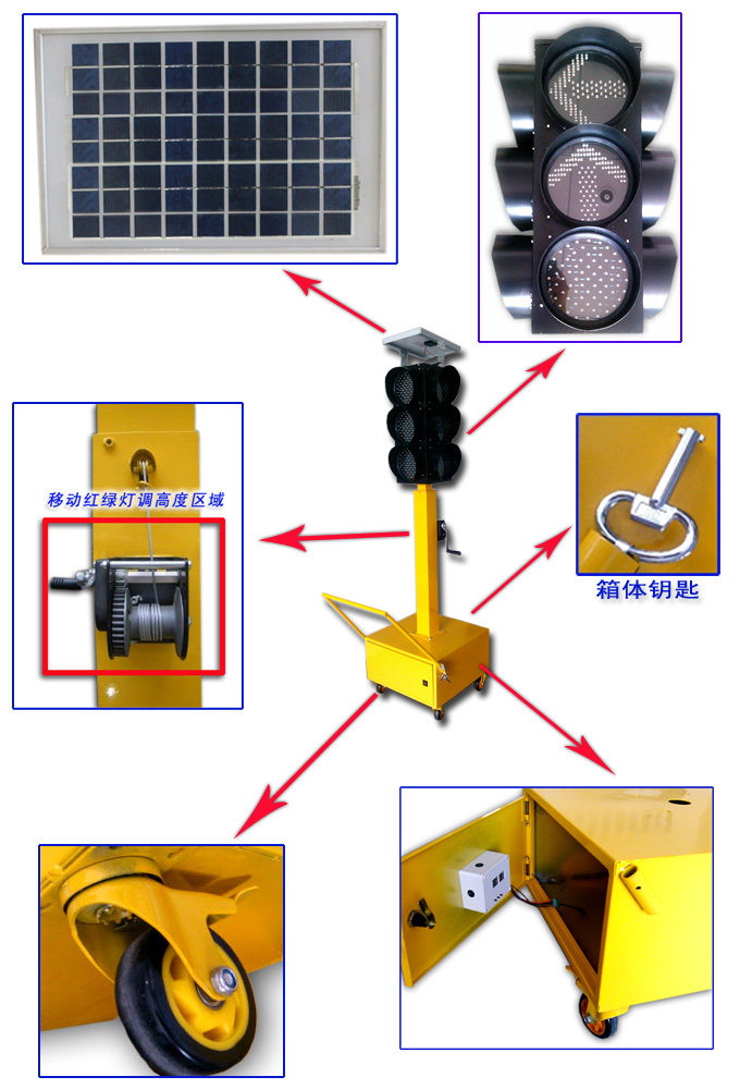 駕?荚嚱煌ㄐ盘(hào)燈是一種可移動(dòng)、可升降的太陽(yáng)能應(yīng)急紅綠燈,采用太陽(yáng)能供電、市電輔助充電,光源采用LED節(jié)能發(fā)光二極管,控制采用微電腦IC芯片,可控制多路。