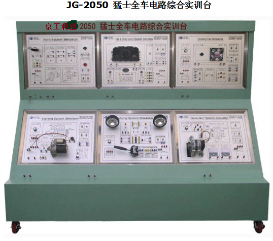 汽車仿真電路實(shí)習(xí)臺(tái) 按照標(biāo)準(zhǔn)汽車電氣線路設(shè)計(jì)而成,外型美觀,操作方便,透明直觀。全車電線束、儀表盤、各種開關(guān)、前后燈光分電器、點(diǎn)火線圈、調(diào)節(jié)器、繼電器、中央線路板,中央控制器、節(jié)氣門組件,均用實(shí)物裝成,各缸點(diǎn)火清楚可見(jiàn),各缸噴油燈光顯示、轉(zhuǎn)速可快慢調(diào)節(jié),自動(dòng)充電,電噴、ABS各傳感器和執(zhí)行器均可用萬(wàn)用表測(cè)試電壓或電流信號(hào),(其中電噴實(shí)驗(yàn)臺(tái)可用試管測(cè)量噴油量大。。教師在實(shí)驗(yàn)臺(tái)上任何部件制造故障由學(xué)生自行排除,拆掉各路保險(xiǎn)絲、繼電器、臺(tái)面上電器接頭,由學(xué)生按照電路圖自行安裝達(dá)到實(shí)習(xí)目的,汽車仿真電氣電路實(shí)習(xí)臺(tái)并配有相關(guān)拆裝工具。 JG-2050 猛士全車電路綜合實(shí)訓(xùn)臺(tái)