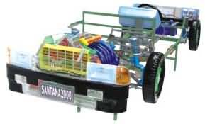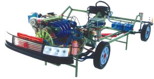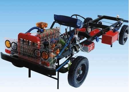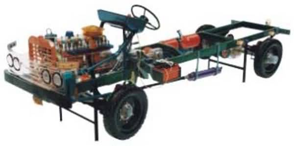 本品選用透明有機(jī)玻璃制作,內(nèi)中部件均以硬質(zhì)塑料料加工,用 螺絲固定在金屬高溫烘漆而成的車架上。各總成部分都以壓模成形加工,代替過去膠粘合的方法,使產(chǎn)品在強(qiáng)度上有很大提高。發(fā)動(dòng)機(jī)總成用電機(jī)驅(qū)動(dòng),在油門處設(shè)有調(diào)速裝置,能演示發(fā)動(dòng)機(jī)轉(zhuǎn)速高低。離合器分離明顯,操縱靈活,離合器外殼整體壓模而成,變速箱和各檔齒輪用各種顏色表示,換檔靈活,手制動(dòng)美觀。后橋外形壓模而成,內(nèi)中主減速、差速轉(zhuǎn)動(dòng)自如,輪轂剎蹄壓模成型,剎蹄可調(diào)節(jié),前橋輪鼓可調(diào)整,轉(zhuǎn)向裝置以及電瓶、油箱、水箱,制動(dòng)管路分布清楚一目了然。電路采用對插件前后分布,燈架、風(fēng)窗、儀表板、后燈架用透明有機(jī)玻璃壓模成整體美觀逼真。