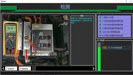 3.4檢測(cè)交互:檢測(cè)界面使用軟件仿真技術(shù),學(xué)員能夠?qū)W習(xí)使用診斷設(shè)備對(duì)高壓電氣系統(tǒng)進(jìn)行檢測(cè)。在檢測(cè)環(huán)節(jié),軟件中準(zhǔn)備了相應(yīng)的測(cè)試工具。可以使用絕緣檢測(cè)儀檢測(cè)高壓電路的絕緣電阻;使用鉗形電流表檢測(cè)系統(tǒng)電路的電流;使用紅外溫度計(jì)測(cè)量重要部件的局部溫度。