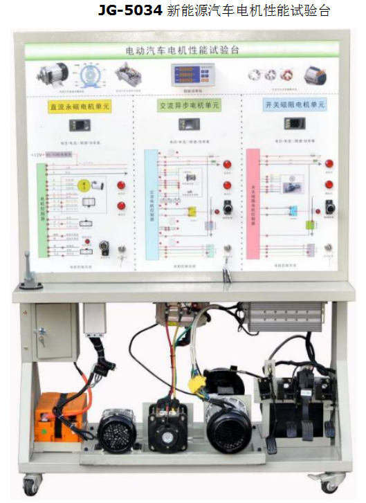 電機(jī)性能試驗(yàn)臺(tái)由實(shí)訓(xùn)臺(tái)架、新能源汽車電池組、三種新能源汽車常用電機(jī)(直流永磁、交流異步、開關(guān)磁阻)、三種新能源汽車配套電機(jī)控制器、加速踏板、檔位器、數(shù)顯電壓電流表、轉(zhuǎn)速表、扭矩表、功率表、臺(tái)式機(jī)電腦(外配套)等模塊組成。