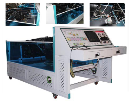 設備包含設備臺架、斜面式控制臺,測量工具盤,工具箱。系統(tǒng)壓力表、原車電池組動力源、檢測面板、、電氣箱、室內溫顯示、室外溫度顯示、設備控制機構、車身系統(tǒng)電控單元、故障設置系統(tǒng)和空調相關系統(tǒng)組成。