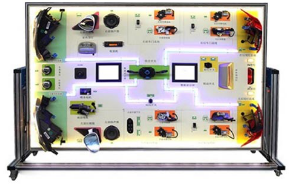 3.裝備結(jié)構(gòu)完整,各器件齊全,全車電器元器件、面板電路原理圖各器件圖形與實物一一對應(yīng),并且標注名稱、同時引出相應(yīng)的檢測端子,可直接在面板上檢測各傳感器、執(zhí)行器、控制單元管腳的電信號,如電阻、電壓、電流、頻率信號等,同時增加,各輔助信號模擬、傳感器模擬裝置、信號電壓表、各電器工作指示燈、使全車電器臺架能夠按照原車功能,全面動態(tài)演示各系統(tǒng)工作狀態(tài),適合于理論與實操一體化教學需要。