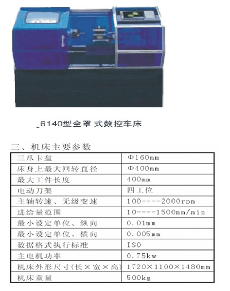 6140 型數(shù)控車床是設(shè)計(jì)精巧的經(jīng)濟(jì)型教學(xué)數(shù)控車床,外殼采用全封閉防護(hù)設(shè)計(jì)。配備高可靠性的 數(shù)控系統(tǒng)。根據(jù)人體工程學(xué)原理,采用機(jī)電一體化方式設(shè)計(jì),造型美觀、操作簡(jiǎn)便、效率高,可以完成端面、外圓、內(nèi)孔、球面、錐面等母線為二次曲線的各種回轉(zhuǎn)體的車削加工,所以它特別適合于教學(xué)事業(yè)。