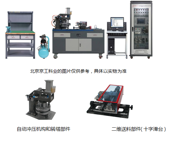 本實(shí)訓(xùn)裝置主要由實(shí)訓(xùn)臺(tái)、電氣控制柜(包括電源控制模塊、可編程控制器模塊、變頻器模塊、觸摸屏模塊、步進(jìn)電機(jī)驅(qū)動(dòng)模塊、伺服電機(jī)驅(qū)動(dòng)模塊、電氣擴(kuò)展模塊等)、動(dòng)力源(包括交流減速電機(jī)、步進(jìn)電機(jī)、交流伺服電機(jī)等)、機(jī)械傳動(dòng)機(jī)構(gòu)、二維送料部件(十字滑臺(tái))、自動(dòng)上下料機(jī)構(gòu)(倉庫)、轉(zhuǎn)塔部件、模具、自動(dòng)沖壓機(jī)構(gòu)、操作臺(tái)、裝配及檢測工具、視頻教學(xué)軟件、 3D 仿真教學(xué)軟件、型材電腦桌等組成。