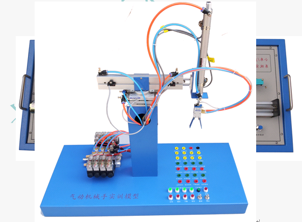 13 、 氣動機械手實訓(xùn)模型 (實物) : 本實訓(xùn)模型是一套完整的氣動機械手搬運裝置,由安裝底板、氣動手指、單桿提升氣缸、雙導(dǎo)桿伸縮氣缸、旋轉(zhuǎn)擺動氣缸、多種類型磁性傳感器、多種類型電磁閥、空氣過濾器、氣源控制滑閥及接線端子排等組成。主要完成物料的搬運功能,氣動機械手通過前臂下降,氣動手指夾緊物體,手臂縮回,手臂右擺,手臂前伸,前臂下降,手爪松開將物體放到指定位置等動作后,機械手返回原位。將電磁閥及磁性開關(guān)等元件的引出線連接到相應(yīng)的端子接線排上,方便使用。能滿足職業(yè)院?删幊炭刂破、機電一體化、氣動技術(shù)等相關(guān)課程的實訓(xùn)教學(xué)?刂齐娫矗 DC 24V
