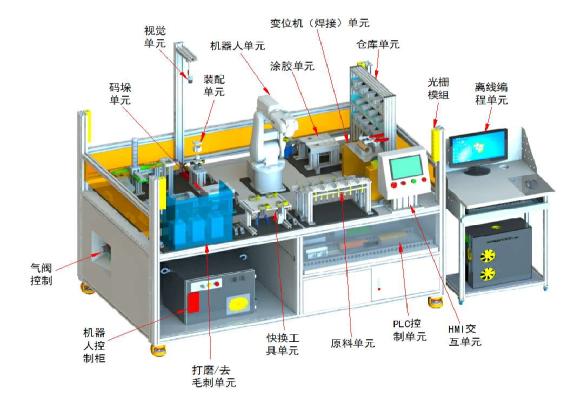 1、本設備是工業(yè)機器人專業(yè)教學訓練綜合實訓設備采用模塊化配置思路,主要包括機器人單元、裝配單元、視覺單元、運動軌跡單元、碼垛單元、快換工具單元、打磨單元、焊接單元、去毛刺單元、倉庫單元、人機交互單元、PLC 單元、離線編程單元、桌面平臺單元以及氣泵等。根據(jù)訓練及考核任務,可快速更換不同模塊,實現(xiàn)不同難度不同技能點的考核。系統(tǒng)深度集成了離線編程技術,軟件不僅包含硬件平臺的三維模型資源,還大大簡化了涂膠、打磨、焊接、碼垛等工藝實現(xiàn)的編程過程、提高軌跡復現(xiàn)精度、避免發(fā)生碰撞干涉。該工作站不僅滿足了職業(yè)院校不同專業(yè)學生針對工業(yè)機器人的操作和編程的教學需求,任務源于工業(yè)的特征也使其更加適于作為訓考平臺。平臺展示了工業(yè)自動化智能制造、生產數(shù)字化、控制網絡化、系統(tǒng)集成化等思想,涉及智能控制技術、工業(yè)機器人技術、機電一體化技術、計算機應用技術、軟件技術、相機測量技術等領域的知識和技能。