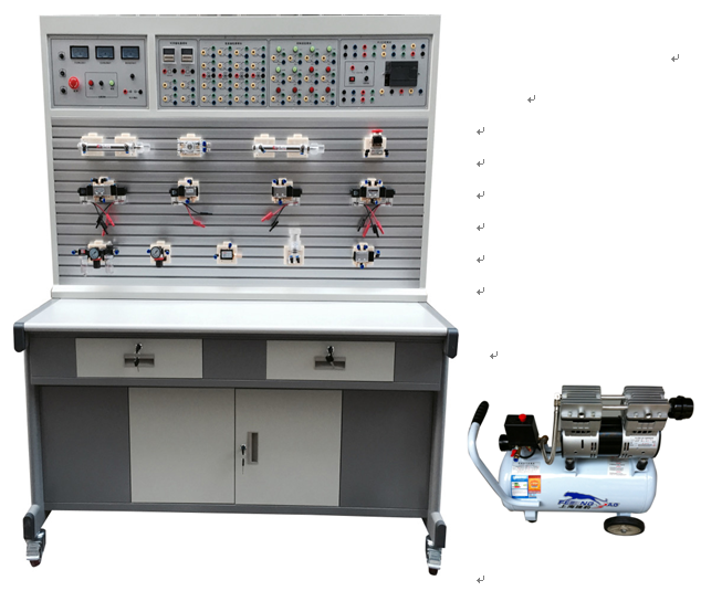 模塊、控制按鈕模塊、時(shí)間繼電器模塊、液壓泵站、液壓元件、氣泵、氣動(dòng)元件等組成。